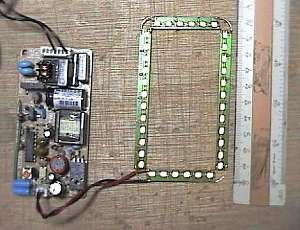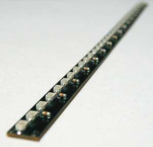 ●生のバーLED とりあえず第一候補ということで、大阪日本橋のデジットで目を付けていたバー LEDを仕入れてきた。 定格 5Vで点灯するもので、緑の LEDが 2個と 30Ωの電流制限抵抗が直列に接続されたものを 1ユニットとして、それが 18ユニット、合計 36個の LEDが横一列に並んだ状態になっている。 ちなみに、お値段 1本200円也。 まずはこれを数本購入し、適当な長さで切断して 7セグメント風の表示装置に仕上げることにする。 本人さん、最初は秋月で売っている超大型のLEDを考えていたみたいだが、内部でLEDが直列接続されている個数が多いため 5V電源では苦しく、色々考えると高くつくのでボツ・・・ |