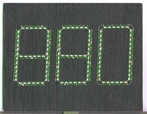 ●全桁分を組み立てたところ 黒く塗装したベニヤ板を用意し、その中央に 3桁分の LEDを組み立ててみた。 ドライブは ICにするかトランジスタにするか決めていないが、何れの場合もアノードコモンにまとめる方が使い勝手が良さそうだ。 と いうことで、プラスのラインが内側になるように配置し、8の字状にスズメッキ線で結線した。 マイナス側は セグメント単位 (3ユニット毎)にパターンをカットして絶縁しておくことにする。 ちなみに、LED基板の裏に両面テープが貼り付けてあったので、そのまま裏紙を剥がしてペッタンコ! |