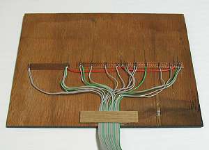 ●表示パネルの裏側 表示パネルの裏側はこんな感じにまとめている。 セグメントの中央付近の位置に足場用としてユニバーサル基板を貼り付け、表側の LED基板に穴をあけて スズメッキ線で結んでいる。 本体とは少し距離を置くことになると思うので、とりあえずは少し長めのフラットケーブルで 結線できるように準備しておくことにする。 |