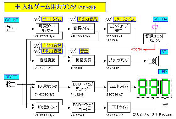 効果音発生用の ICで適当なものがあれば良いのだが、なかなか「すぐおいしい」レベルのものは見つからなかった。 適当な C-MOSゲートで