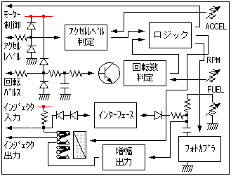 ロジック ICは両者の信号を判定し、回転数とアクセルレベルが何れも設定値を超えた場合に出力をハイレベルにする。
