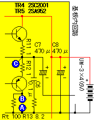 ここまで OKの場合、続いて「A」「C」間の電圧を測ってみよう。 Cは出力端子のコンデンサを通る前のポイントで、 無信号時の出力トランジスタ TR4〜TR5のバランス状態を調べていることになる。 正常な場合、 ここの電圧は電源電圧の約半分になるはずだ。 万一ここの電圧が 3Vから±1V近くずれている場合、誤配線を疑ってみよう。