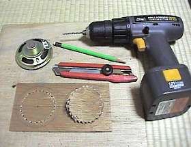 一通り各部に使う板がカットできたら、スピーカーの取付穴をあけてみよう。 今回は 80φのスピーカーを使ったが、当然ながら入手したスピーカーによって最適な穴の大きさは異なってくる。 まずは実物を板の上に並べ、上下左右のバランスを目視で微調整した後、鉛筆で周囲をなぞってしまおう。 スピーカーの隅っこには「エッジ」という緩衝剤を貼り付けた領域が数oほどあるので、 この少し内側辺りの位置に印を付けてドリルで円周状に連続穴をあけてしまい、後はカッターで穴の間をつなげば一丁上がりだ。 分厚い板なら「回し引き鋸」という専用工具でやるんですけどネ・・・ おっと、最後はヤスリ掛けをお忘れなく (^^; |