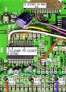 まずは基板オモテ面。 最初にパターンカットを 3ヶ所行わないといけない。 TR1〜3から、その下に並んだ抵抗に パターンが伸びているので、それぞれカットする。 すぐ横のトランジスタのベース端子にリード線をハンダ付けしよう。 TR1が青、TR2が緑、TR3が赤色用だ。 次に TA8696Fの端子への信号線引き出しが 3ヶ所。 Pin30が H-SYNC、Pin28が CLAMP、Pin21が FF CONT用だ。 あと、液晶コネクタの 3Pinから V-SYNC、4Pinから H INV用、適当なパスコンの端子から 追加回路用の Vcc5Vと GNDの配線を引き出せばとりあえず信号関係は完了だ。