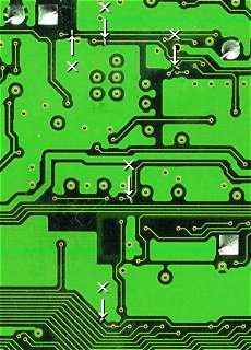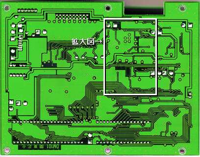 最後に基板裏面。 細かくて恐縮だが 5ヶ所ほどパターンカットがあるので、慎重に処理して欲しい。 何れも 目標物が乏しいので間違えないように注意しよう (^^;