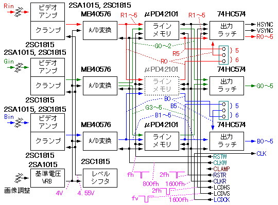 入力された RGB映像信号は、まず半固定抵抗で個別にレベル調整された後、ビデオアンプで A/Dコンバータの要求する入力レベルまで増幅している。 今回使った MB40576は約 1Vppの入力でフルスケールとなるので、 入力信号レベル 0.7Vpp+VRによる調整余裕を加味して約2倍のゲインを持たせることにした。 また、映像信号系は AC結合による増幅となるので、この後に映像信号のいちばん低い部分のレベルを揃えるため、トランジスタ 1石による