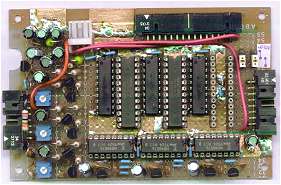 今回はアナログ回路の部品点数もかなり多く、色数を増やすためにとラインメモリを 3本に増設できるようソケットとジャンパーピンも付けたため、 少々基板のスペースが苦しくなっている。