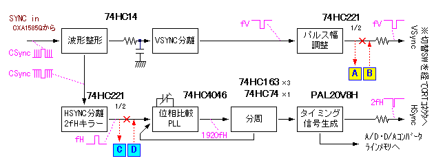 同期信号のモトである映像信号が最初に到達するのは、SONYの CXA1585QというICだ。 このIC内部で水平垂直が混合された状態の同期信号が分離され、74HC14によって波形整形された後、 CRによる積分回路で周波数分離によって垂直同期信号が取り出される。 これはさらに 74HC221による ワンショットマルチでパルス幅を調整され、75Ωの抵抗と電源スイッチを兼ねたパソコンからの信号との 切り替えスイッチを通って CRTコネクタに出力されている。