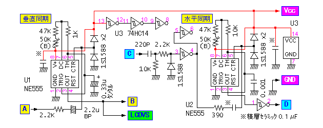 この追加回路部分の入出力としては、先ほどのポイント A〜Dの他、電源とGNDの接続が必要だ。 また、液晶パネルに加える 垂直同期信号も配線の都合上ここから取るのが良さそうなので、接続ポイント [LCDVS] を併せて記している。