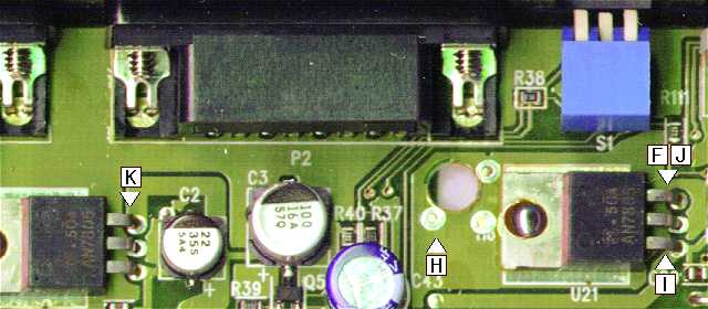 U21(7805)の OUT端子に、[F]と[J]のリード線を一緒にハンダ付けする。