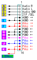 電源および音声関係では特に追加回路は必要ないので、そのまま基板から信号を引き出して コネクタにつないでしまうことにする。 尚、イメージはパネル正面が手前を向いた状態で図示している。