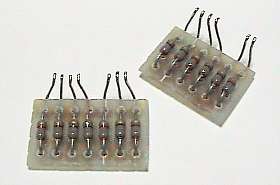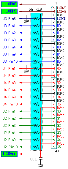左上の写真が今回作成したツールで、ユニバーサル基板の切れ端に 68Ωの抵抗を6本または7本取り付け、足を反対側から ぐるっと回して整形したものだ。 要は反射による影響を軽減するためのダンピング抵抗と、信号線および GNDを配線するための「足場」を兼ねている。 足が 7本のものと6本のものがあるが、クロック信号を 青色用のラインメモリから取るので、U3(青用)は 7本のものを、U4(赤用)と U2(緑用)は 6本のものを使用する。
