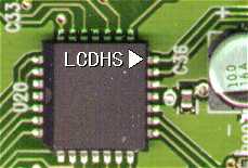 LCDHSの引き出しポイントだが、実験の項目で記した切り替えスイッチのところよりも、U3(青用)ラインメモリの隣にある U20(PAL20V8H)の底辺右端の端子(18Pin)から引き出した方が取り回しが楽なので、ぜひそうして欲しい。 詳細は左の写真をどうぞ。