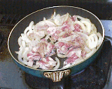 さて、タマネギの色が少し変わってきたら肉とハムを入れよう。 そして