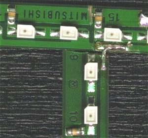 ●LEDの拡大イメージ ちょうど 8の字の中央部分を拡大してみた。 LEDはチップタイプでなかなか小粒に見える。 電流制限用の抵抗はチップタイプではなく、円筒形の リードレスタイプのようだ。 尚、LEDは少し斜体表示にする方が見栄えが良いようなので、こころもち斜めに貼り付けてある。 あと、マイナス側の パターンカットについても確認しておこう。 |