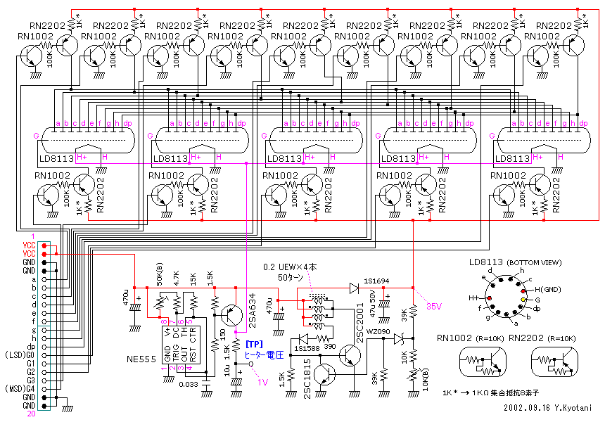 各セグメントおよびグリッド用の 35Vはトランジスタによるブロッキング発振回路で作っている。 トランジスタが