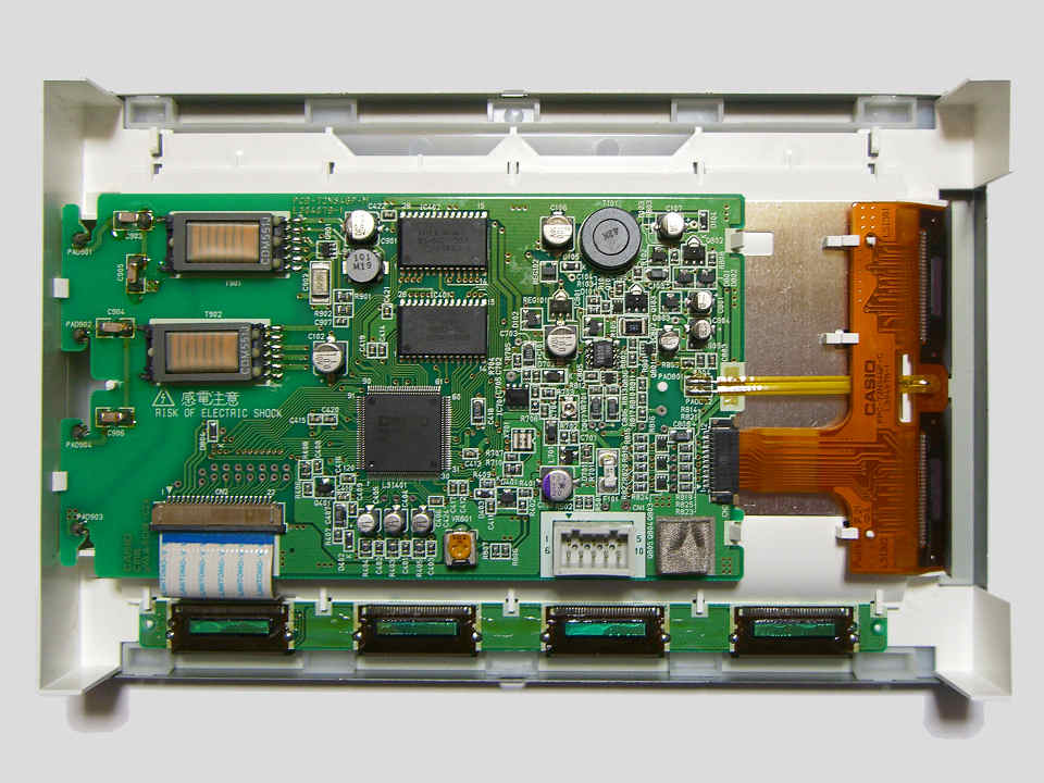まずは左上のイメージから。 液晶パネルのウラ蓋を外して内部を見ると、主要回路は基板一枚にまとめられている様子が 読み取れる。 向かって左上のブロックはバックライトインバータ。 1組の発振回路から 2個の高圧トランスが駆動され、さらに 2本の蛍光管へと接続されている。 中央部分のブロックは、映像処理に関する主要回路が収められているようだ。 メインのチップとしては、CASIOロゴの入った 120Pin QFPのチップ MB87A921A。 富士通製のカスタムチップ? あと、そこから直近には OKIの MSM518221-30Jが 2個。 256KWord×8Bitの画像用フレームメモリだ。 ひらめきはアタリかな (^^) そして右上のブロックは、液晶のロウ、カラム信号線ドライブ用として必要な電源回路群など。 温度変化に対する補正用と思われる サーミスタも基板外に接続されている。 |