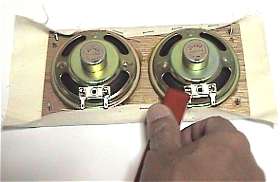 ケース各部材の貼り付け完了。 スピーカーもサランネットとアングルが付いて、だいぶそれらしくなってきたようだ。 ベニヤ板同士の貼り付けは「木工用ボンド」だけだが、それなりの強度に仕上がっている。 基本的には、貼り合わせた後ガムテープの切れ端等を使って仮止めしておくだけで良いが、 隙間ができると弱くなるので、乾いた後でもう一度隙間に木工用ボンドを充填しておこう。 十分に乾燥させた後、貼り付け面の段差をカッターやヤスリで整えておけば完璧だ。 |