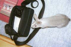 カメラバッグに興味を示したようだ・・・・ 早く片付けへんと、かじられるかも?!
