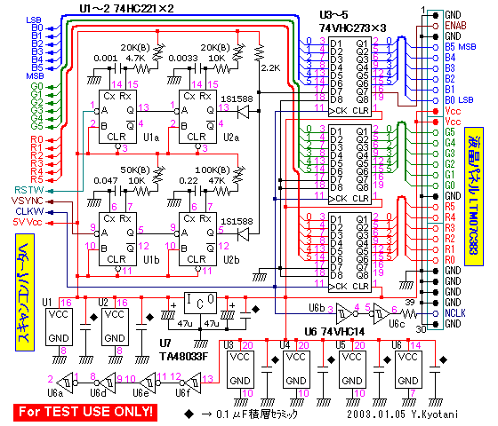 1.A/Dコンバータからラインメモリへ至る信号のうち、RGB各上位 6ビットを分岐して抜き出す。