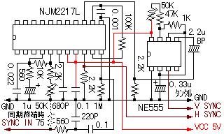 さらに垂直同期信号についても、NE555を使った無安定発振回路を用意し、これに NJM2217Lで分離した垂直同期信号で