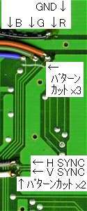 2本発見できるが、これが H-SYNCと V-SYNCだ。 これらについても同様にランドのそばでパターンをカットし、