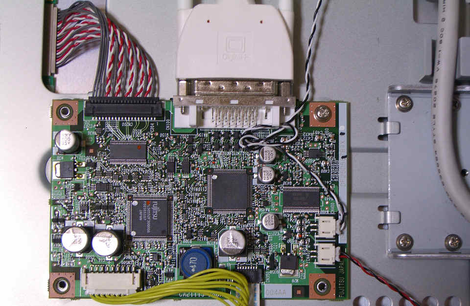 裏側から見て左側、つまり前面からだと右端に LEDとボタン4個。 これで明るさと音量の UP/DOWNができるようだ。 スイッチの装着されている基板と信号処理基板とは、フレキシブルケーブルで接続されており、何とバックライトインバータ基板の 直下を横断している (^^; 右上の写真は、信号処理基板の入出力用コネクタ付近を映している。 この白いコネクタを外して確認してみると、反対側 (PCの映像出力に接続する) コネクタと同じモノが取り付けられているようだ。 もう一つ 欲しいなぁ・・・ |