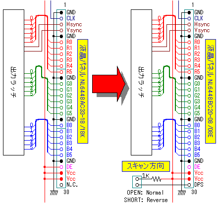 信号関係は、実はそのままの結線で差し替えても動作するのだが、せっかく画面反転ができるようになったので、