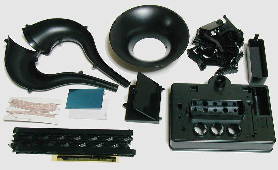 旧型電蓄を連想させる「ラッパ型」ホーン、ループ型アンテナの巻き枠などが印象的。 選局用のバリコンも、 昔のラジオに付いていたような ローター と ステーター の 重なり面積を回転角によって変える 構造のモノではなく、ネジを回すことで対向距離を変える 構造のモノが使われている。 右上のイメージは、電機部品を取り出して並べてみたところ。 箱に収められた真空管が3本、真空管のピン曲がりを矯正するためのストレーナー、イマ風の樹脂製振動板スピーカー、 何やらヘンテコな造りのセラミックイヤホン(クリスタルイヤホンではない)、接点などの金属製部品が添付されている。 主要回路はプリント基板に収められているが、こちらは残念ながら 組み立て済み である。 |