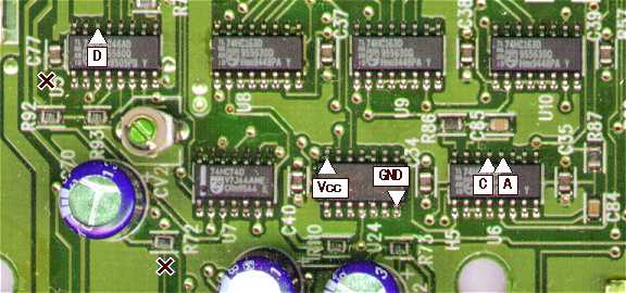 引き出しポイント 6ヶ所以外にパターンカットが 2ヶ所存在するので、慎重に位置を確認して欲しい。 また、 垂直同期信号を本来の回路に戻すための [B]ポイントのみ、少し離れた場所に存在するので注意しよう。
