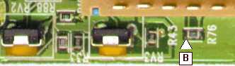 電源スイッチのパネルから遠い方に R76(75Ω)があり、片側はスイッチにつながっている。 反対側は先ほど [A]〜[B]間をカットしたパターンなので、こちら(写真では左側)にリード線をハンダ付けする。