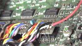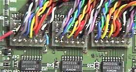 LCDHSの引き出しポイントだが、実験の項目で記した切り替えスイッチのところよりも、U3(青用)ラインメモリの隣にある U20(PAL20V8H)の底辺右端の端子(18Pin)から引き出した方が取り回しが楽なので、ぜひそうして欲しい。 詳細は左の写真をどうぞ。